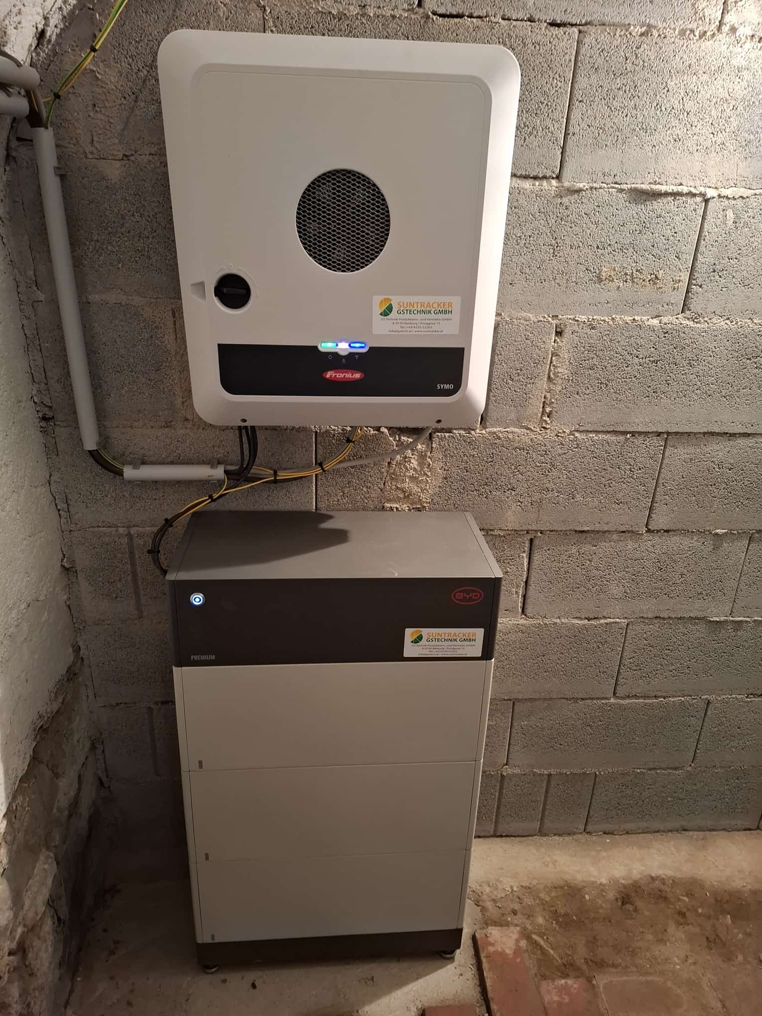 Dieser Suntracker 1800R wurde auf einem Punktfundament montiert. Dazu ein Energiespeicher Fronius & BYD Battery Box Premium HVS mit 7,7kWh nutzbarer Speicherkapazität mit automatischer 3-phasiger Notstromfunktion.